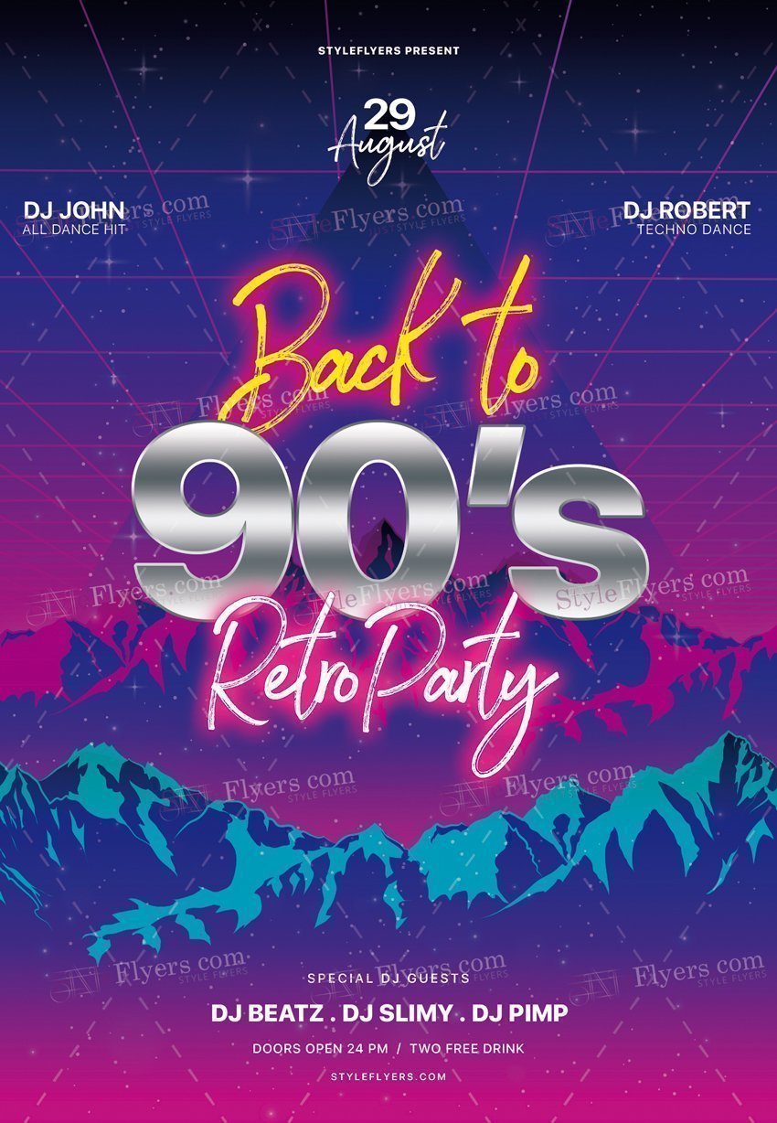 Back-to-90s-Retro-Party_psd_flyer PSD Template Package – Professional PSD template. Fully layered, easy to customize, print-ready. Includes free fonts. StyleFlyers quality since 2013.