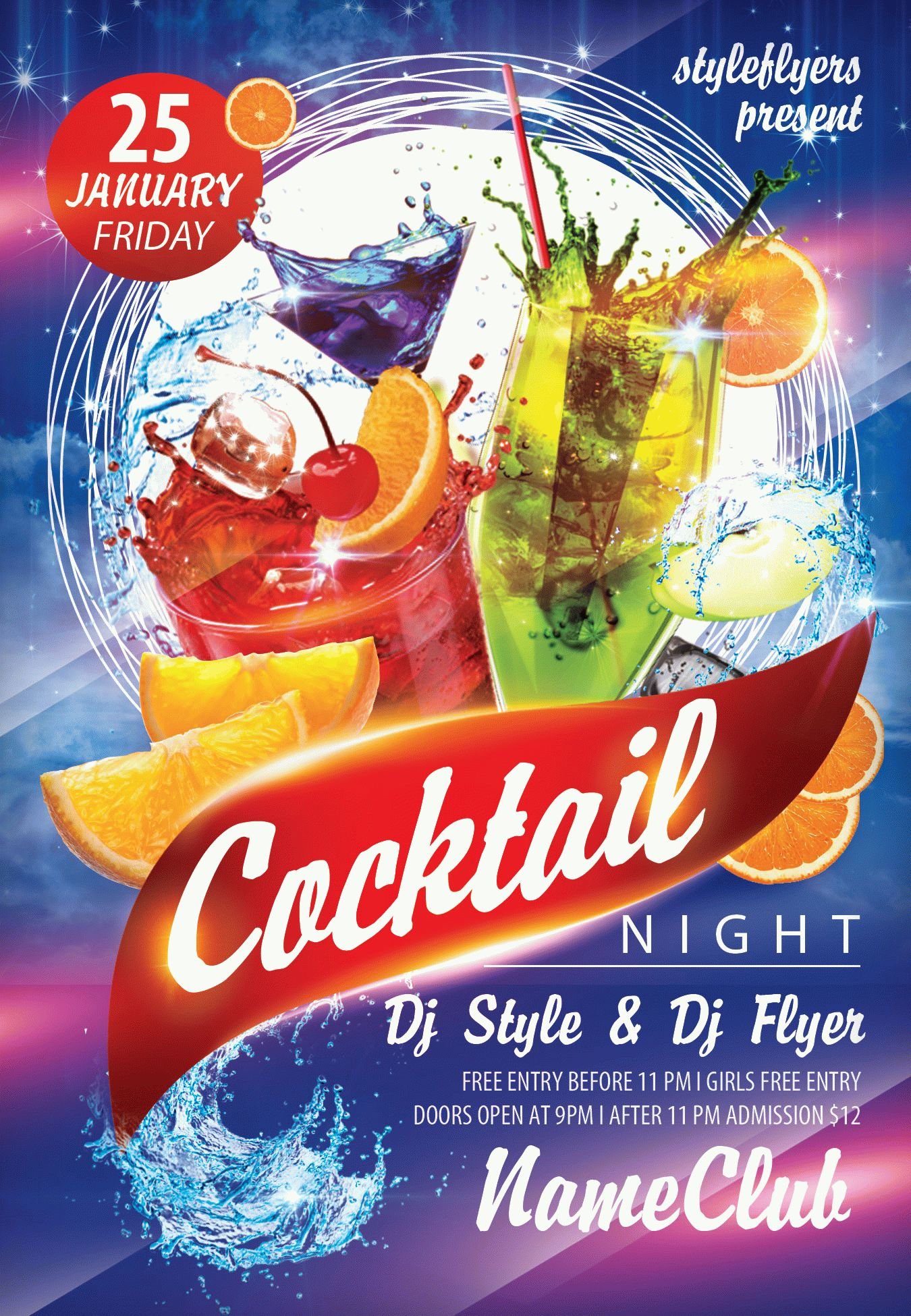 cocktail-night PSD Template Package – Professional PSD template. Fully layered, easy to customize, print-ready. Includes free fonts. StyleFlyers quality since 2013.