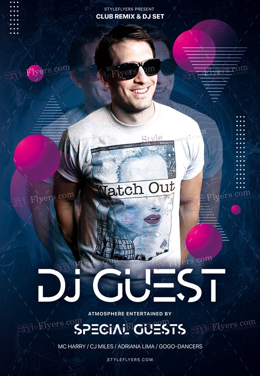 DJ-Guest-PSD-Flyer-Template PSD Template Package – Professional PSD template. Fully layered, easy to customize, print-ready. Includes free fonts. StyleFlyers quality since 2013.