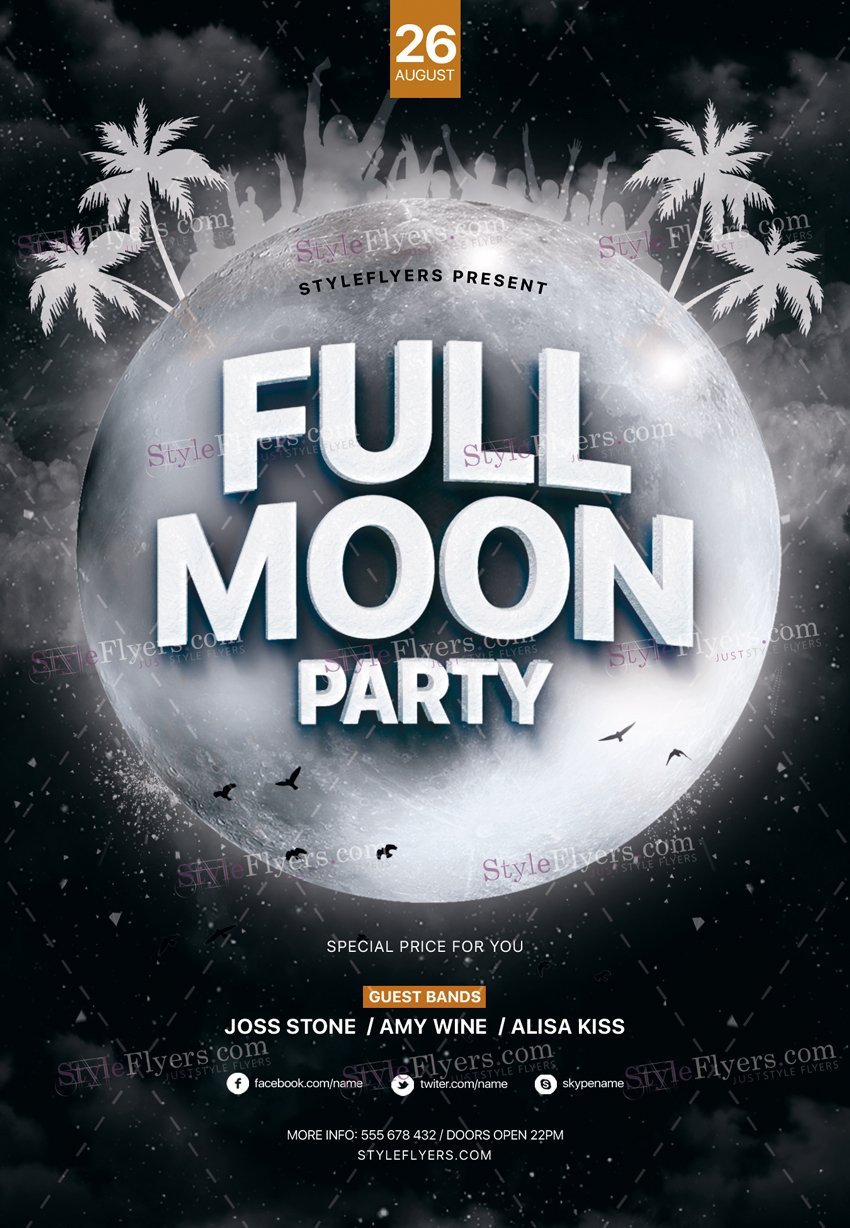 Full-Moon-Party-PSD-Flyer-Template PSD Template Package – Professional PSD template. Fully layered, easy to customize, print-ready. Includes free fonts. StyleFlyers quality since 2013.
