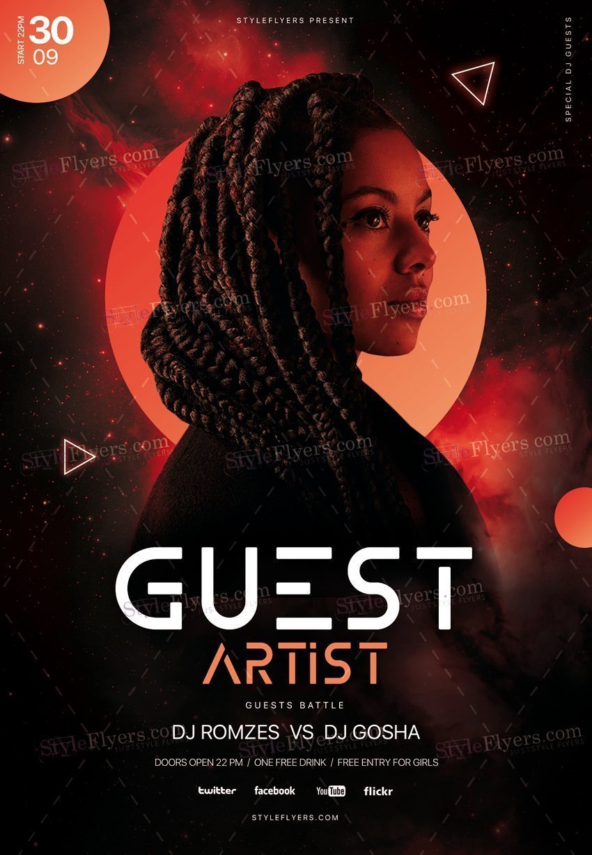 Guest-Artist-PSD-Flyer-Template PSD Template Package – Professional PSD template. Fully layered, easy to customize, print-ready. Includes free fonts. StyleFlyers quality since 2013.