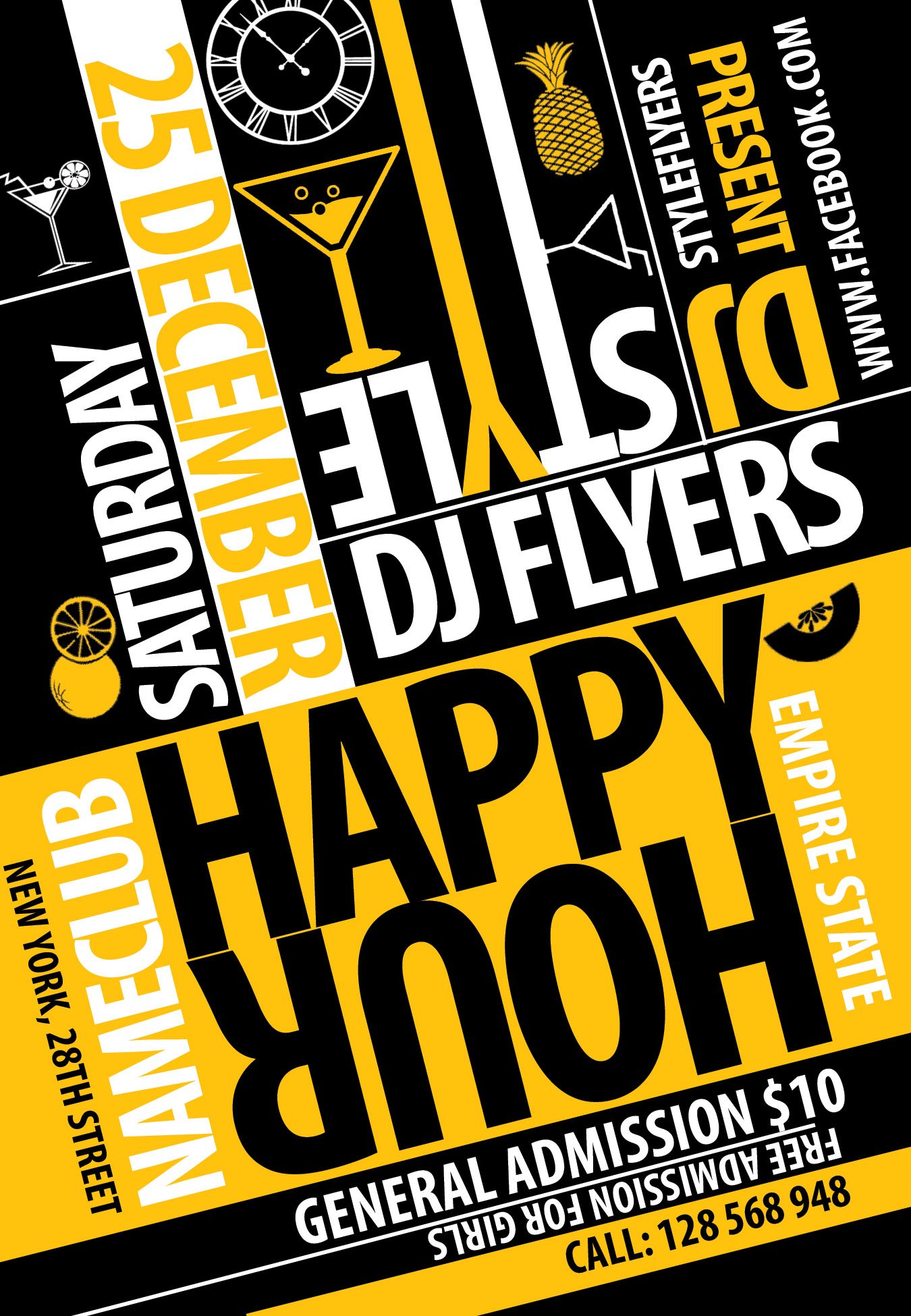 Happy-Hour-flyer1 PSD Template Package – Professional PSD template. Fully layered, easy to customize, print-ready. Includes free fonts. StyleFlyers quality since 2013.