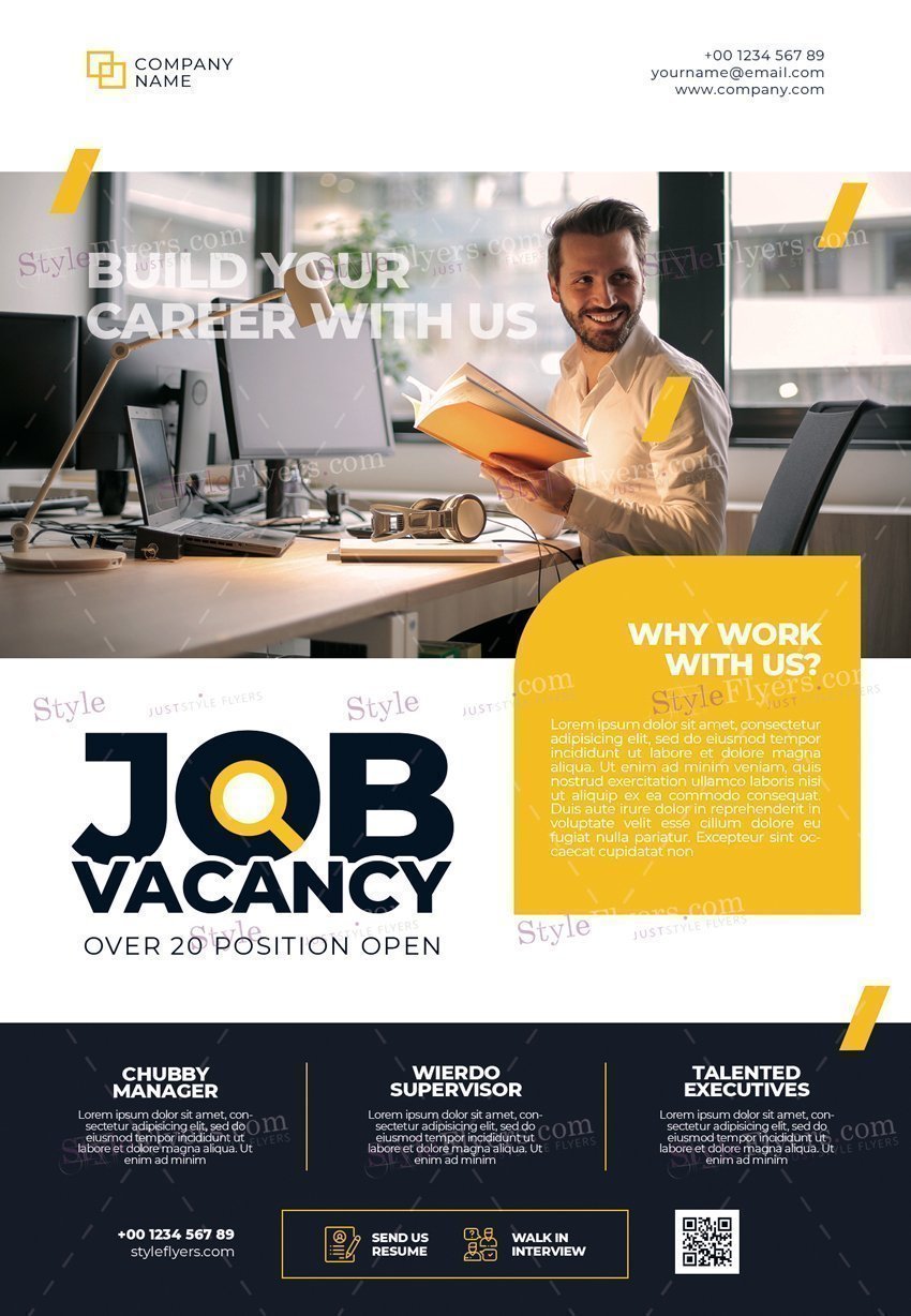 Job-Vacancy-PSD-Flyer-Template PSD Template Package – Professional PSD template. Fully layered, easy to customize, print-ready. Includes free fonts. StyleFlyers quality since 2013.