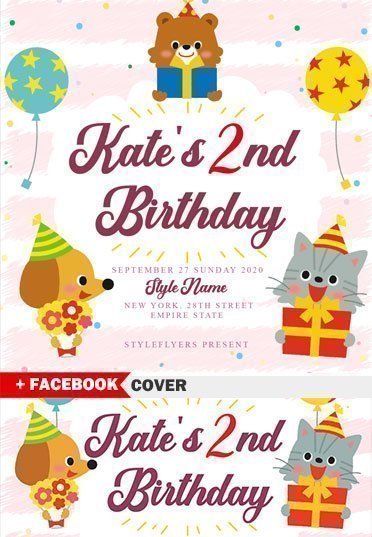 Kates-2nd-Birthday-Flyer-Template PSD Template Package – Professional PSD template. Fully layered, easy to customize, print-ready. Includes free fonts. StyleFlyers quality since 2013.