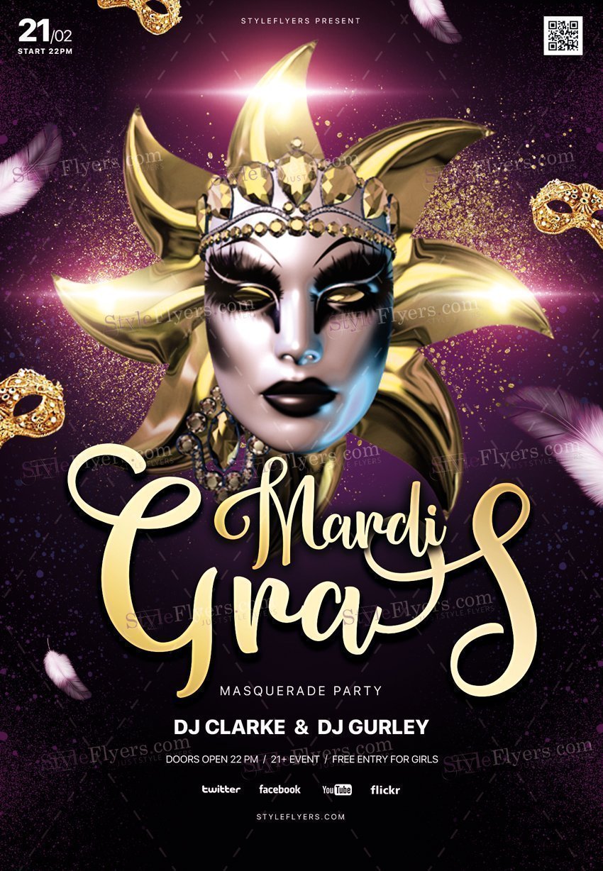 Mardi-Gras-PSD-Flyer-Template PSD Template Package – Professional PSD template. Fully layered, easy to customize, print-ready. Includes free fonts. StyleFlyers quality since 2013.