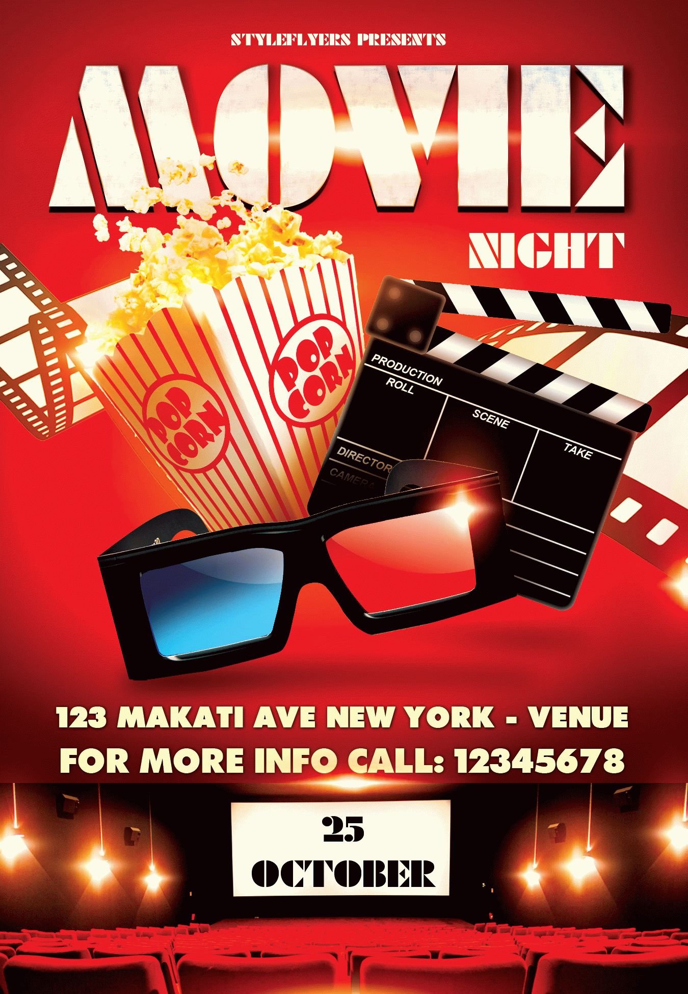 Movie-night-party-flyer PSD Template Package – Professional PSD template. Fully layered, easy to customize, print-ready. Includes free fonts. StyleFlyers quality since 2013.