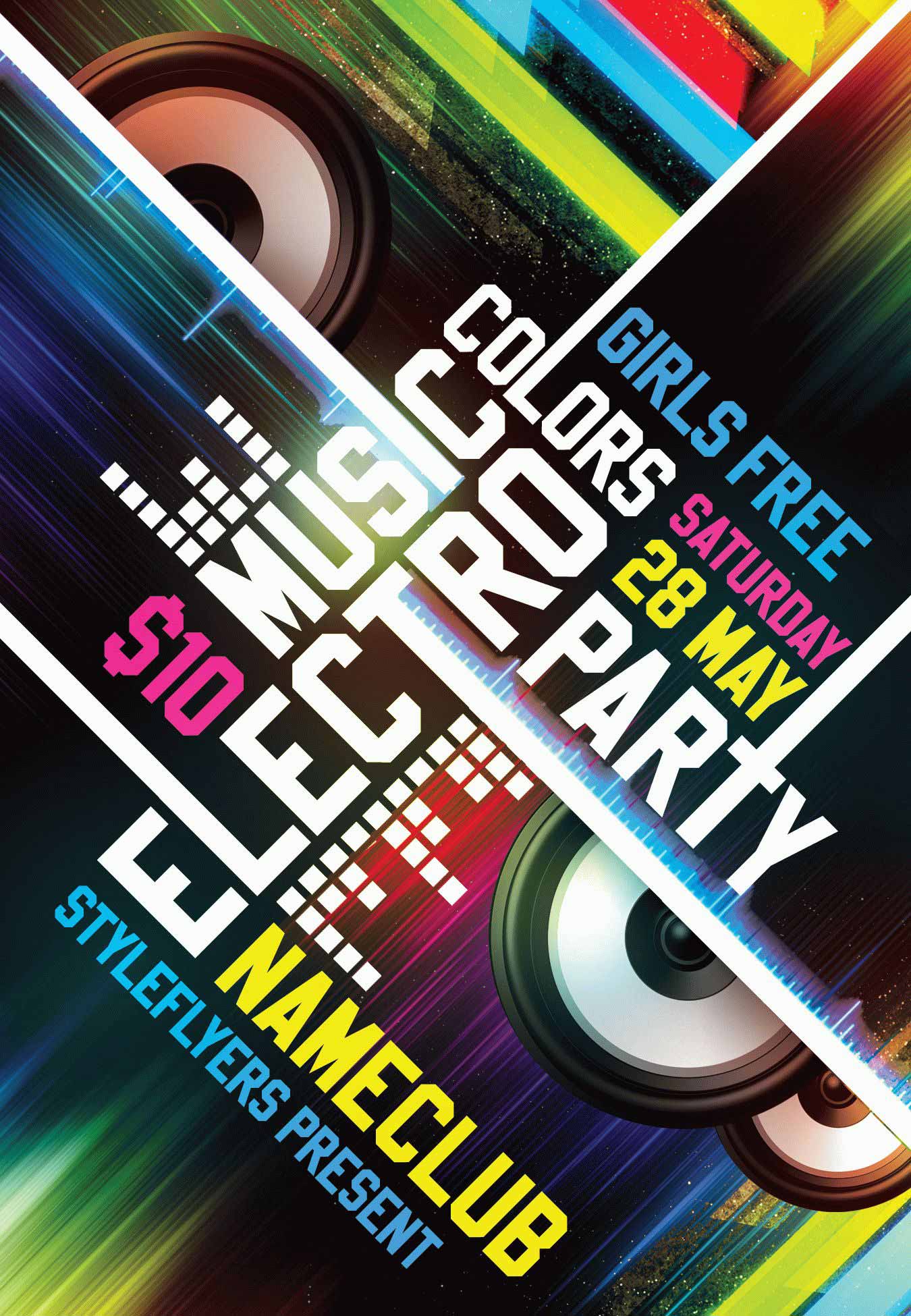 music-colors-electro-party PSD Template Package – Professional PSD template. Fully layered, easy to customize, print-ready. Includes free fonts. StyleFlyers quality since 2013.