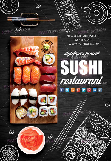 Sushi PSD Template Package – Professional PSD template. Fully layered, easy to customize, print-ready. Includes free fonts. StyleFlyers quality since 2013.