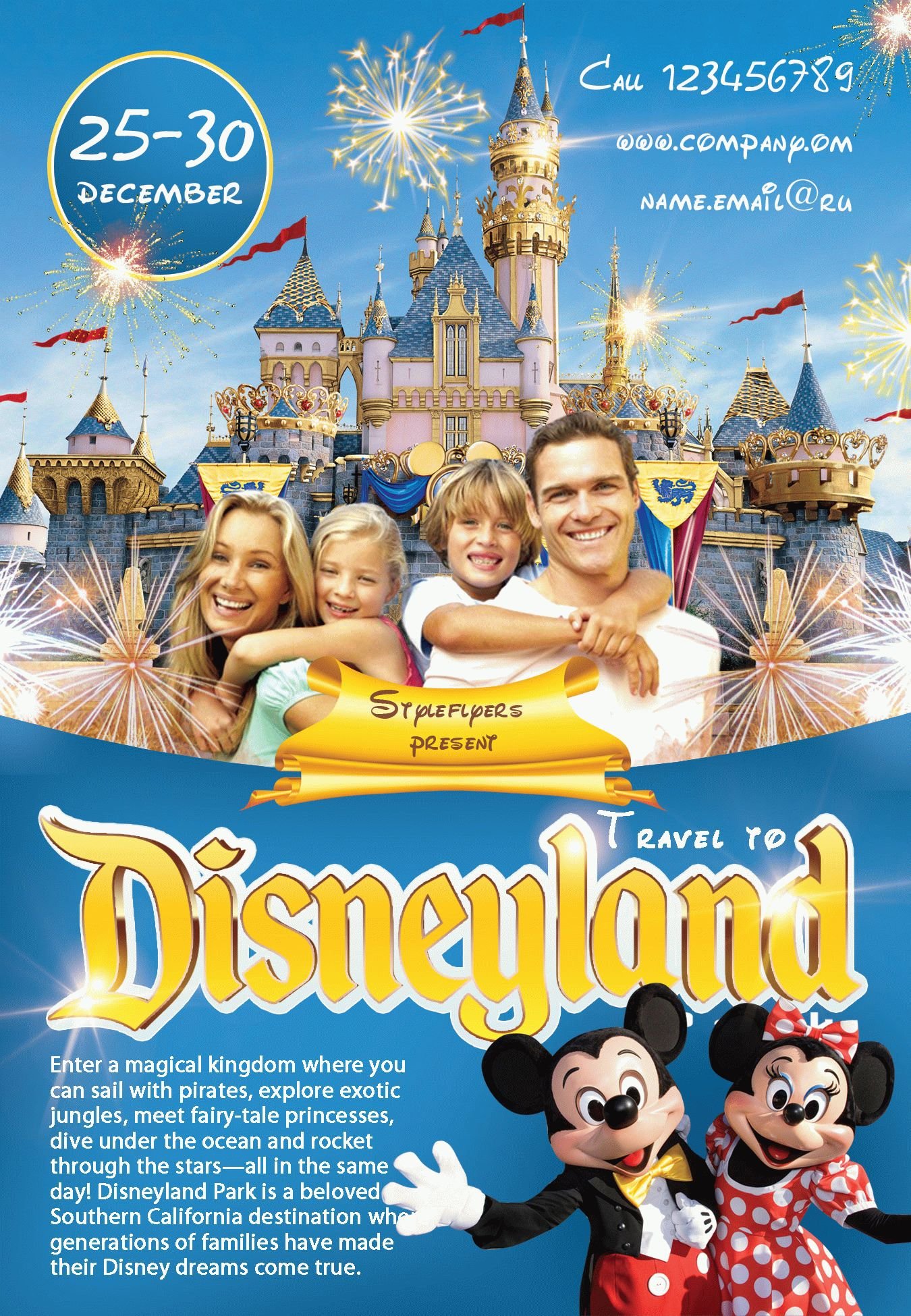 Travel-to-Disney-Land PSD Template Package – Professional PSD template. Fully layered, easy to customize, print-ready. Includes free fonts. StyleFlyers quality since 2013.