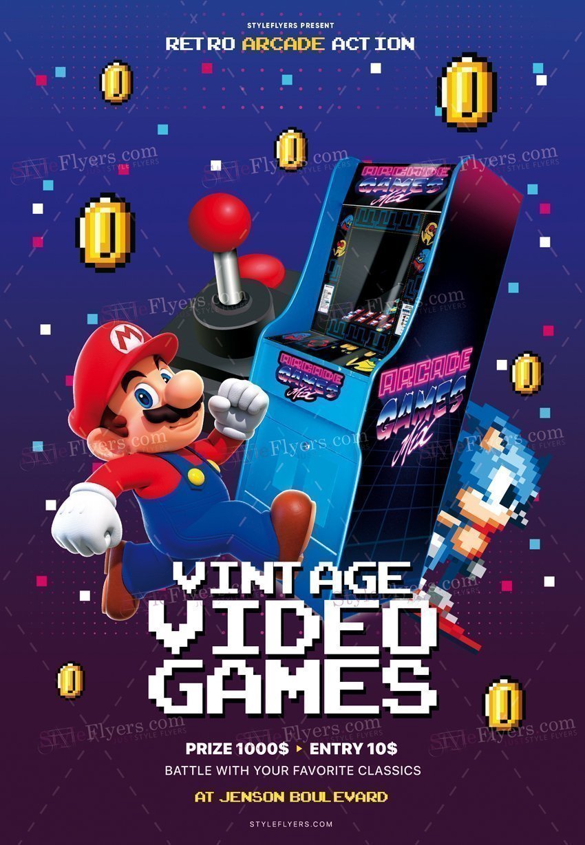 Vintage-Video-Games-PSD-Flyer-Template PSD Template Package – Professional PSD template. Fully layered, easy to customize, print-ready. Includes free fonts. StyleFlyers quality since 2013.