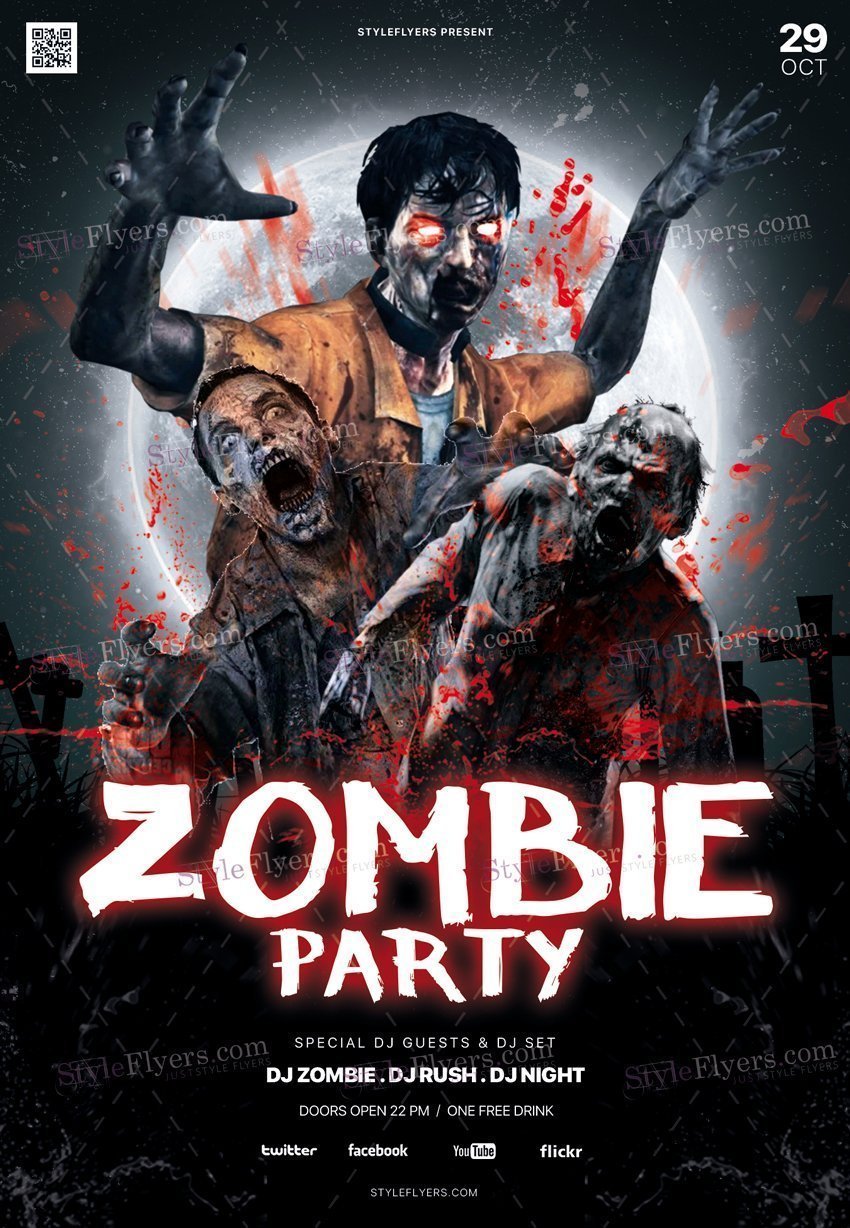 Zombie-Party-PSD-Flyer-Template PSD Template Package – Professional PSD template. Fully layered, easy to customize, print-ready. Includes free fonts. StyleFlyers quality since 2013.